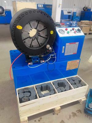 Questa macchina per il crimping del tubo di gomma idraulica da 4 pollici è dotata di un design speciale con 16 matrici comodamente appese sul lato per un facile accesso.questa macchina industriale di colore blu offre un funzionamento efficiente per varie applicazioni di crimping del tubo.